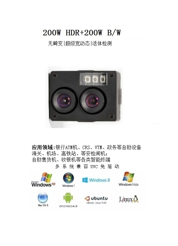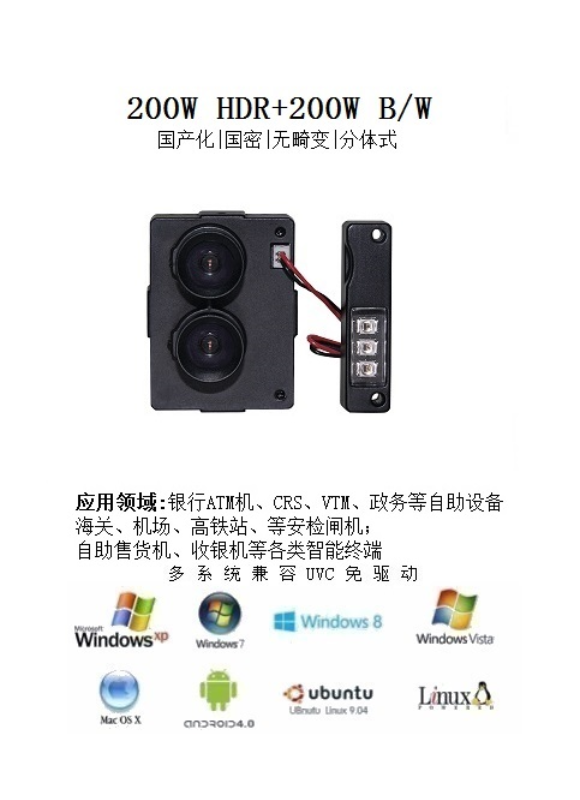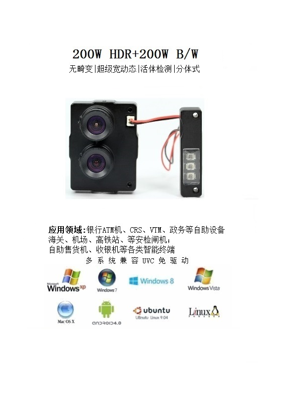 Product feature(产品特性)·1/2.5” 工业级双目130/300万高清宽动态图像传感器·内嵌国密IC,支持数据加密·黑白最大30帧,彩色最大30帧,无卡顿·0.1Lux 超低照效果·USB2.0高速传输·符合专业USB-IF WHQL RoHS CE(4KV/8KV)认证·标准UVC协议,兼容Windows XP&7&8.¥ 0.00立即购买